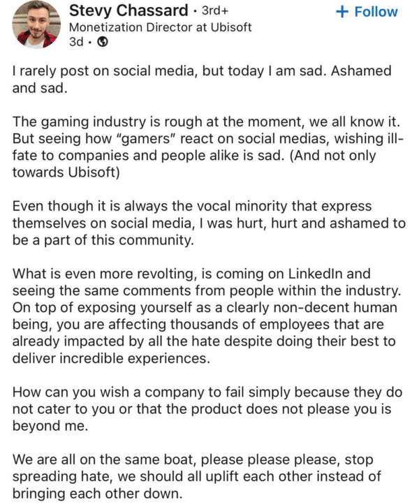 While it’s never good news when a company is failing and in danger of closing shop, it seems some gamers — and even devs — aren’t losing sleep about it. This sentiment hasn’t escaped the eyes of Ubisoft’s Monetization Director Stevy Chassard, who vented his frustrations in a now-deleted post on LinkedIn.